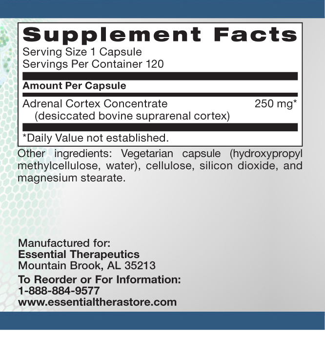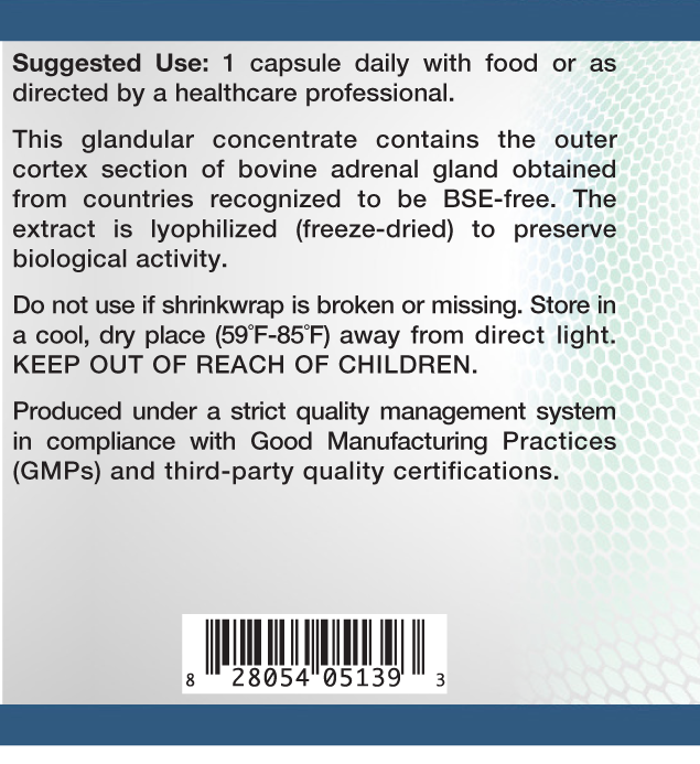 Ingredients: This glandular concentrate contains the outer cortex section of bovine adrenal gland obtained from countries recognized to be free of BSE. The extract is freeze dried to preserve biological activity.
