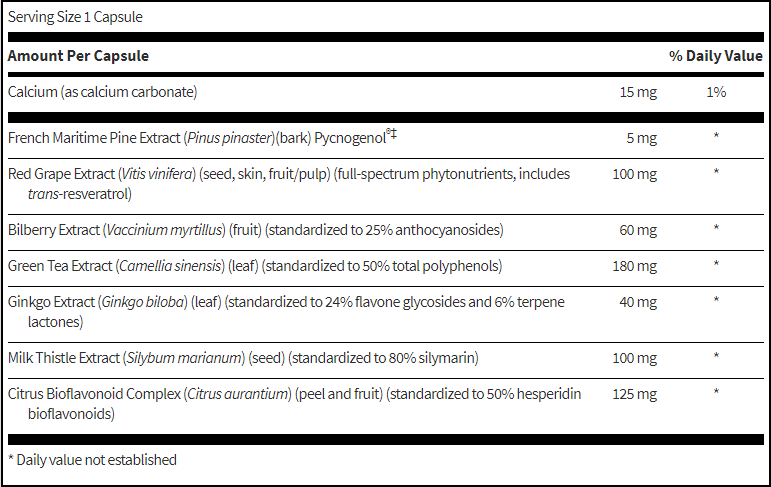 - Pycnogenol® Pine Bark Extract – Unique, patented extract from Horphag Research supplying proanthocyanidins and organic acids.
